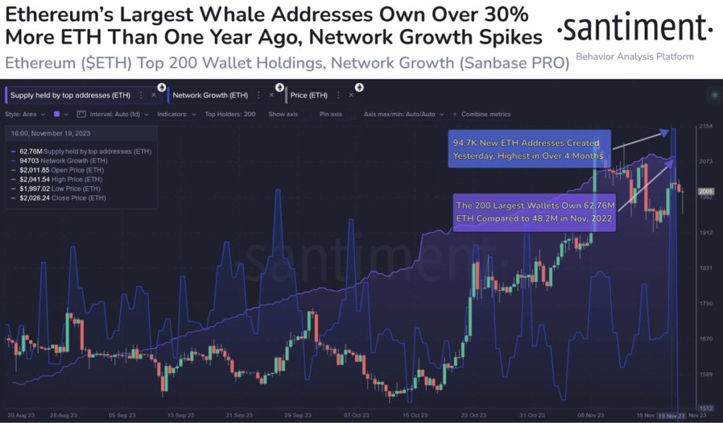 In line with Santiment, the highest 200 ETH whales at the moment are holding greater than 62 million ETH valued at about $124.1 billion, a rise of round 14.5 million ETH from the identical time final 12 months.