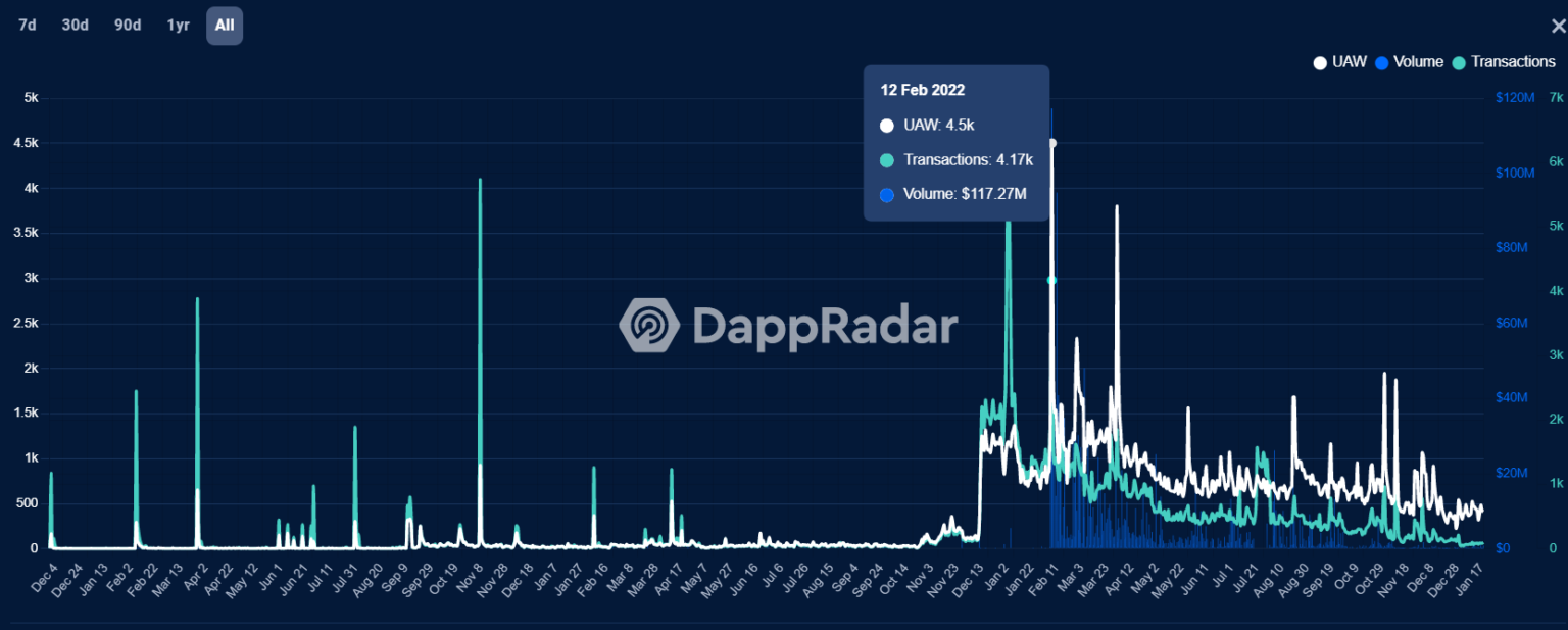 Arguably, metaverse euphoria peaked within the final quarter of the identical 12 months when Fb rebranded to Meta. Nevertheless, the utilization statistics of the 2 hottest metaverse platforms, The Sandbox and Decentraland, remained unimpressive all through the worth surge. Fewer than 5,000 distinctive energetic wallets (UAWs) had been interacting with the good contracts on the peak on each platforms.