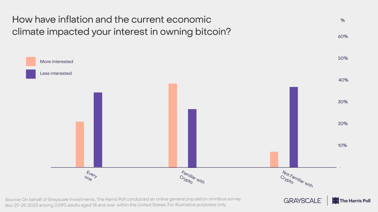 The ballot additionally finds that Individuals view inflation as probably the most regarding difficulty. Nevertheless, solely these accustomed to digital belongings mentioned inflation makes them extra desirous about buying Bitcoin (BTC), which is commonly seen as a hedge in opposition to forex debasement.