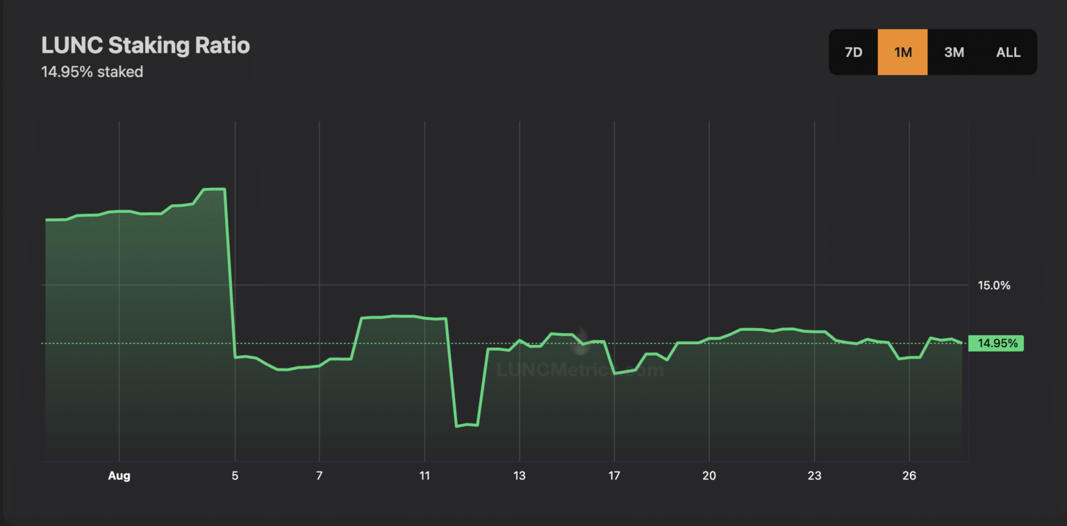 The month up to now has been marked by a decline in LUNC staking. At 14.95% at press time, the full proportion of staked LUNC from its circulating provide has plummeted by 1%.