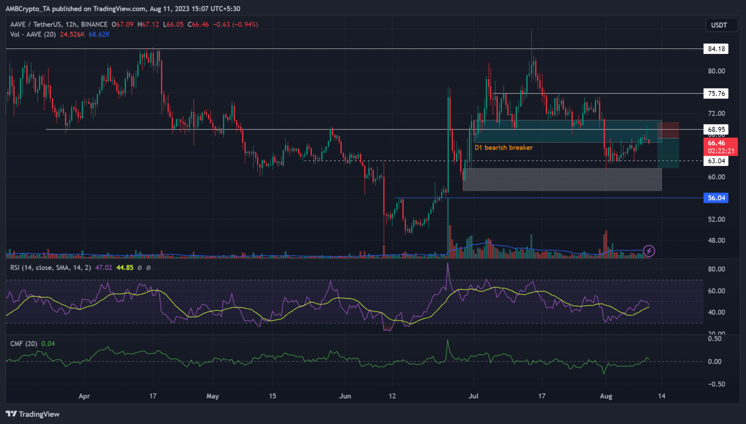 Aave [AAVE] may very well be on the mercy of sellers if the press-time bearish strain creeps into the weekend. The altcoin dipped to $61.5 in early August amidst elevated market uncertainty, however was bolstered by Bitcoin’s [BTC] restoration round 7-10 August. However the +11% tucked after gracing $69 was at stake after BTC’s sharp reversal.