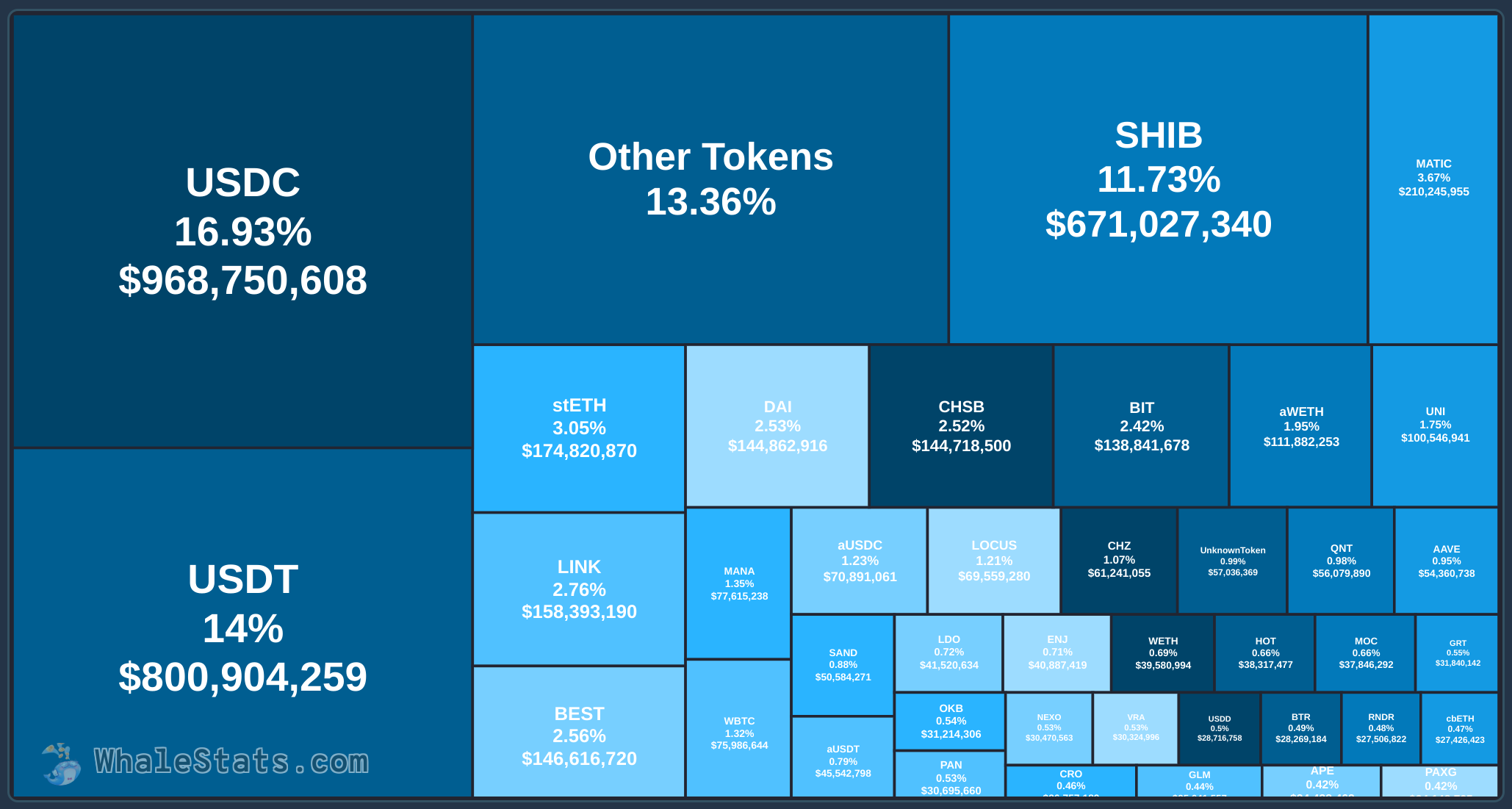 Blockchain-tracking service WhaleStats reveals that the biggest 1,000 Ethereum whales have collected greater than $671 million value of SHIB and $210 million value of MATIC.