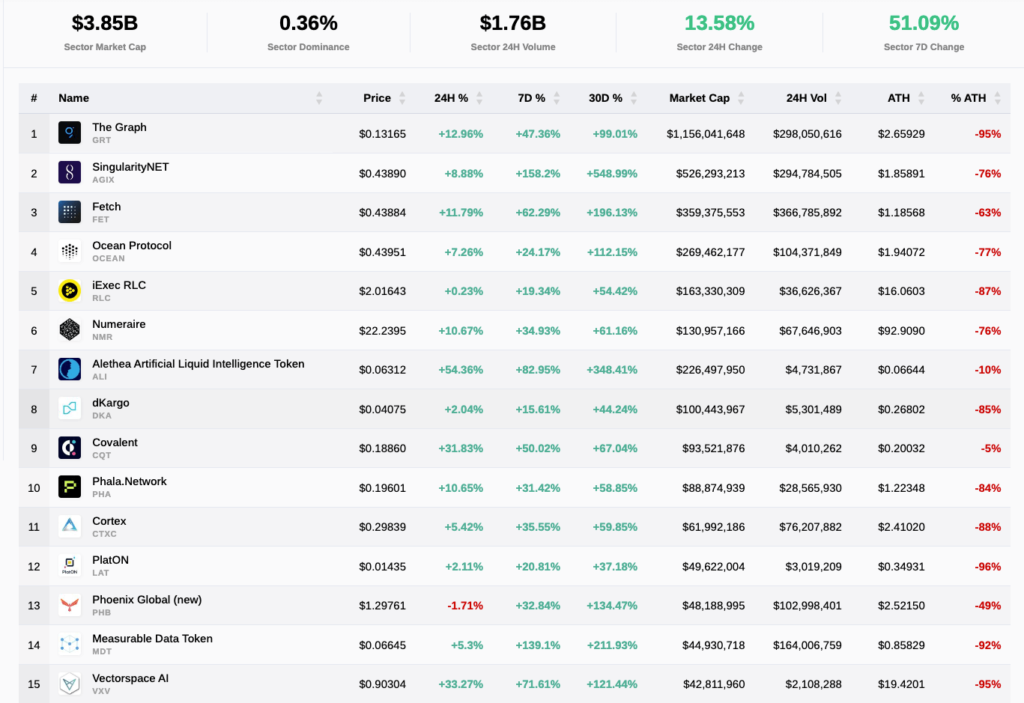 GRT is the top-ranked AI crypto by market cap at over $1.1 billion, with a dominance of over $500 million to its closest competitor (SingularityNET, whose market cap presently stands at $517 million). GRT is a decentralized platform for indexing and querying knowledge from blockchains, particularly designed for the decentralized internet (Web3). It makes use of a novel indexing and querying mechanism that permits quick and environment friendly knowledge retrieval from decentralized sources, making it a key infrastructure element for decentralized functions (dApps).