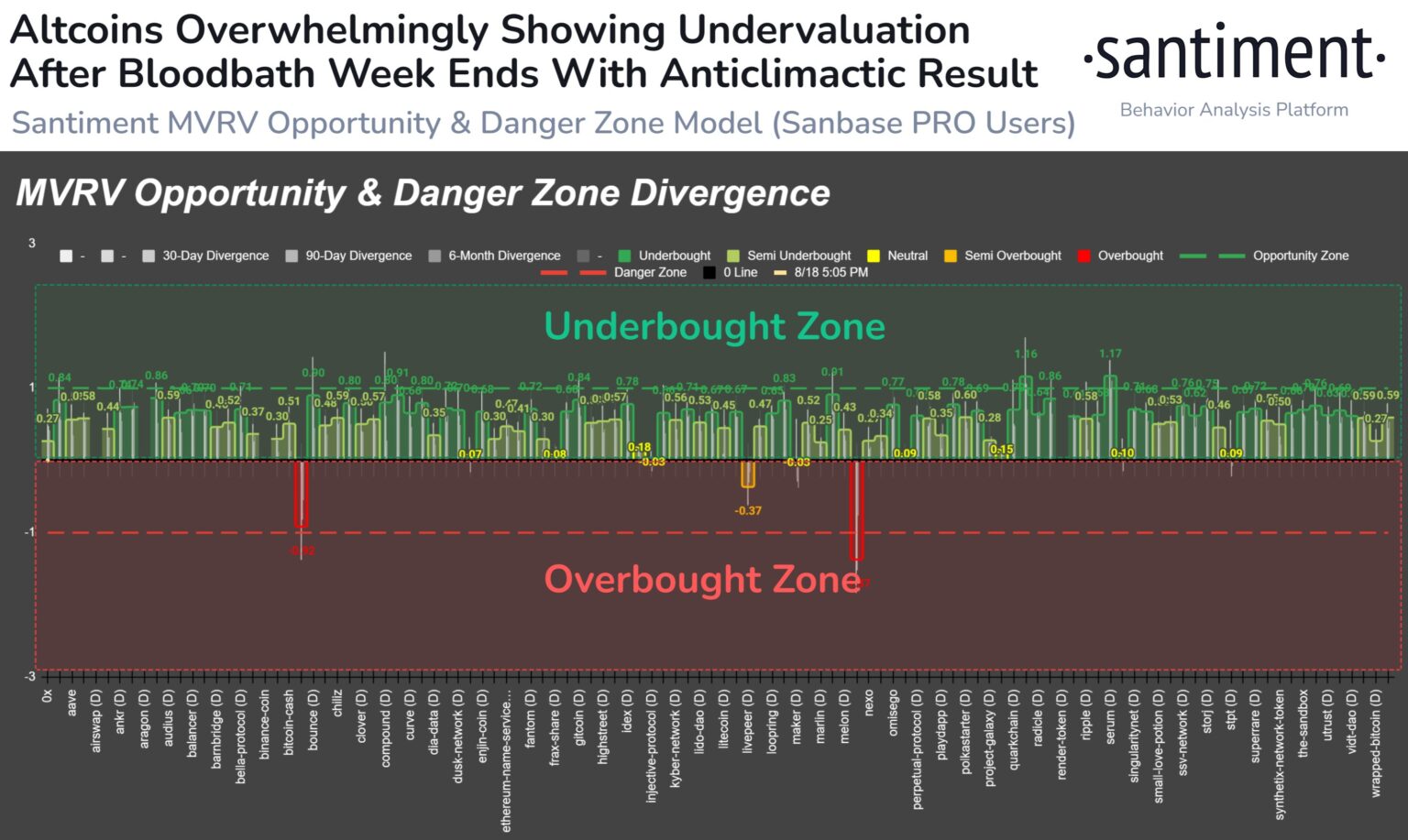 Utilizing the market worth to realized worth (MVRV) metric, which gauges whether or not a crypto asset is overvalued or undervalued, Santiment finds that almost all of altcoins are at the moment buying and selling within the underbought zone.