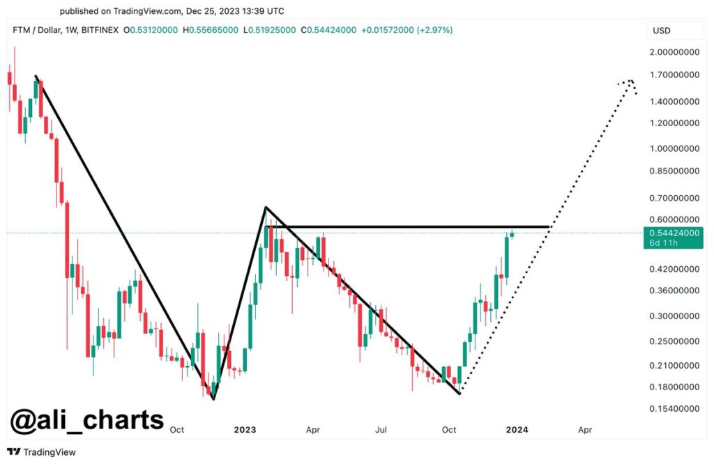 Dealer Ali Martinez tells his 37,800 followers on the social media platform X that the good contract platform Fantom (FTM) seems to be forming a big bullish reversal sample on the weekly chart.
