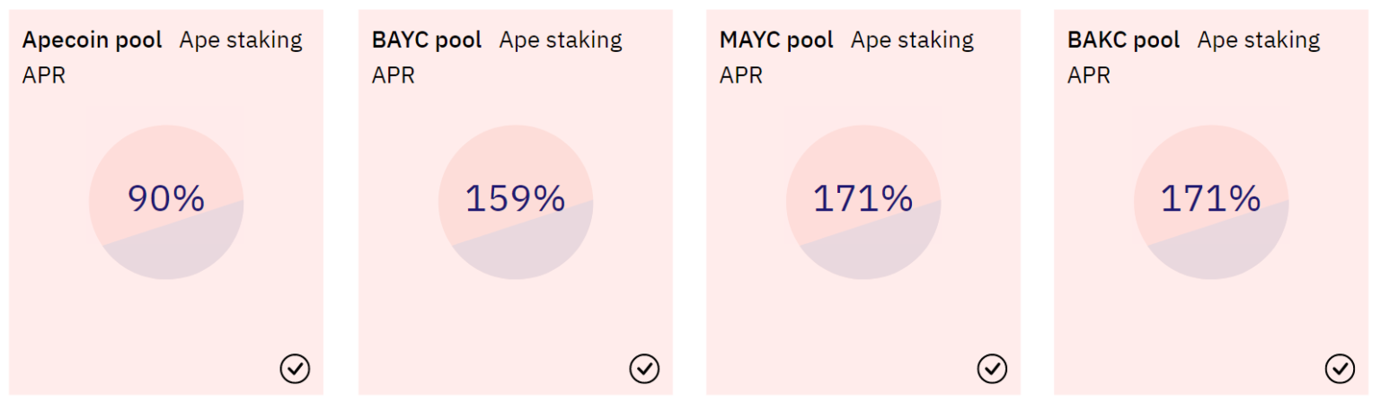 ApeCoin DAO launched its APE staking mechanism in December. The APE staking pool yielded 90% annual returns within the first two months. Holders of the Bored Ape Yacht Membership (BAYC) NFTs and associated collections are eligible for twice the yields of round 171%, including vital promoting stress for the token.