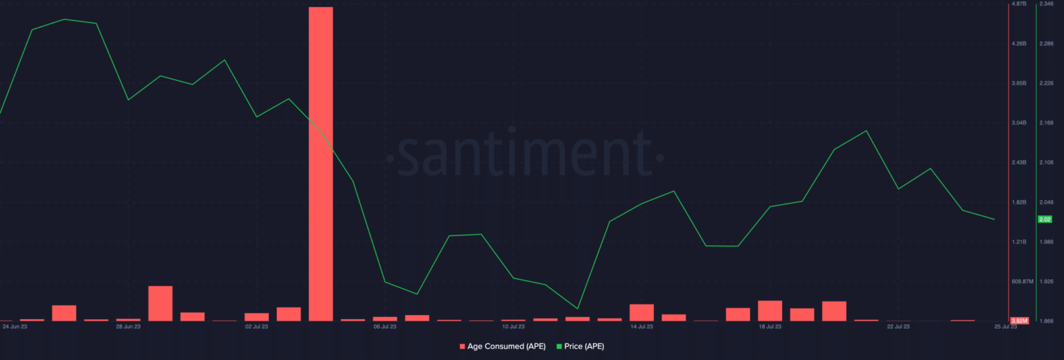 An evaluation of APE’s Age Consumed revealed that the alt skilled a spike on 4 July. The uptick was adopted by a fall in APE’s worth, which means that the altcoin clinched a neighborhood prime at $2.15 and launched into an uptrend.