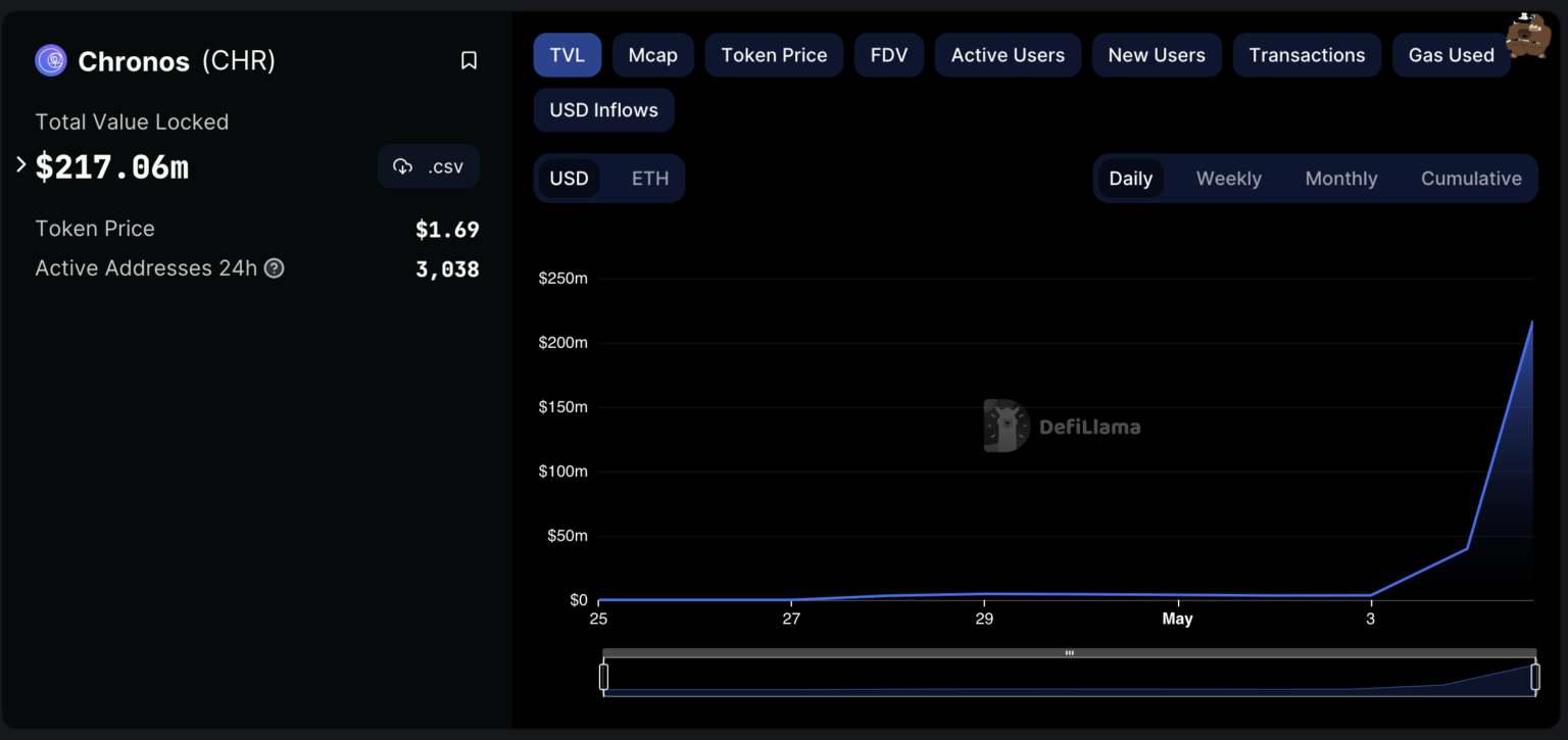 Decentralized alternate (DEX) Chronos set a brand new milestone on Might 4, reaching $217 million in whole worth locked (TVL) on the time of writing, simply seven days after its launch on the Arbitrum blockchain.