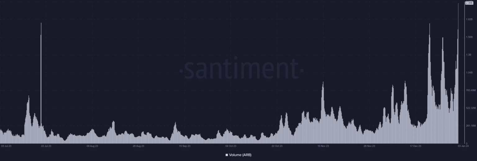 Arbitrum has witnessed a notable rise in buying and selling quantity, with a very vital surge over the past three days. Evaluation of the amount chart on Santiment confirmed that the ARB quantity was round $1.3 billion on 2nd January.