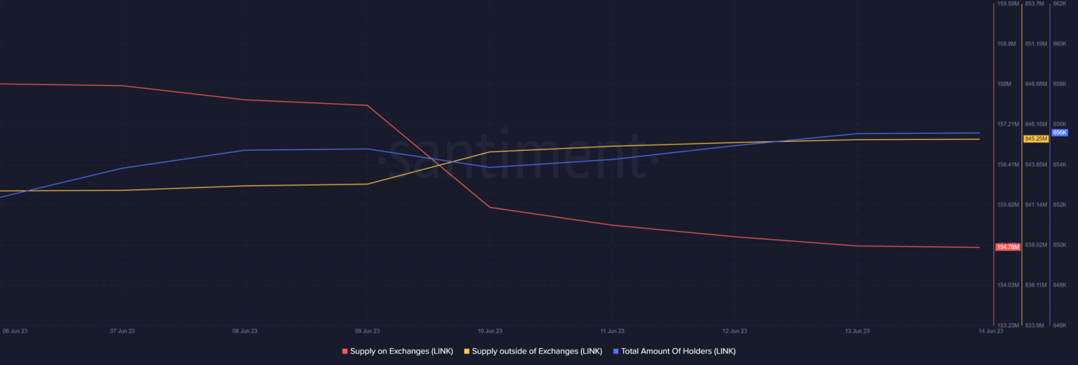 The same accumulation development was additionally plotted on Santiment’s chart. As per the info, Chainlink’s provide on exchanges went down. This was accompanied by a rise in its provide outdoors of exchanges, which is bullish.