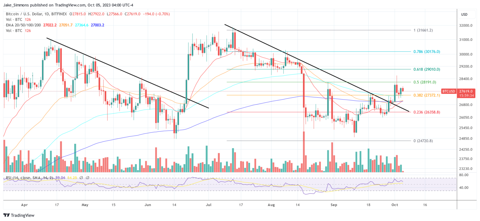 Delving deeper into the dynamics, Hayes extrapolated his prediction into 2024. He talked about, “Both we face a monetary disaster the place charges plummet to zero, or we expertise a slower enhance in charges in comparison with authorities expenditure.” In each eventualities, Hayes anticipates a bullish final result for Bitcoin, seeing it contact across the $70,000 mark by the top of 2024.