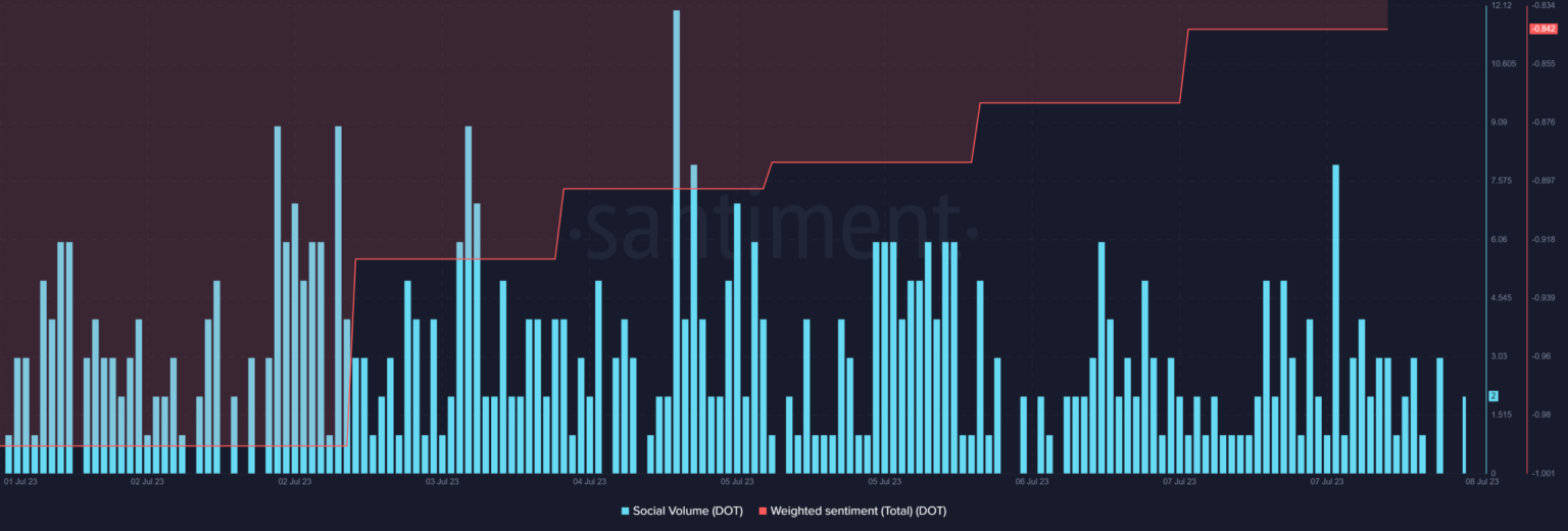 Although the worth confirmed minimal response, weighted sentiment across the token improved. DOT’s social quantity was additionally comparatively excessive, reflecting its recognition within the crypto house.