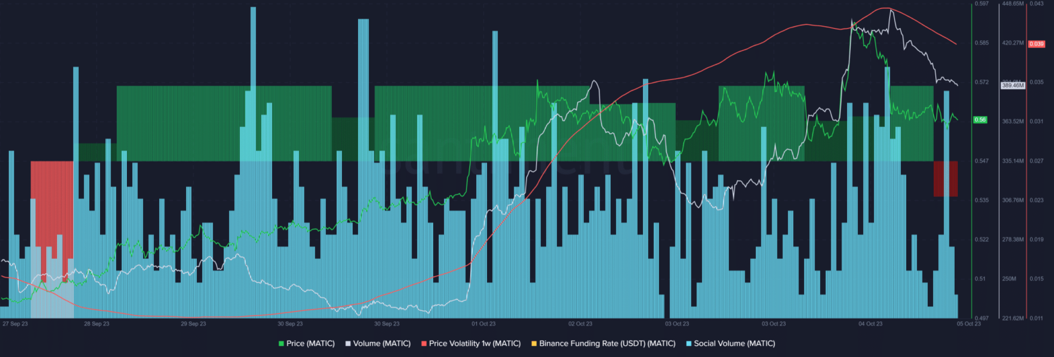 On the time of writing, MATIC was buying and selling at $0.5611 with a market capitalization of over $5.2 billion. Whereas the worth surged, MATIC’s buying and selling quantity additionally elevated, which is usually a optimistic growth. Due to the worth uptick, MATIC’s 1-week value volatility spiked final week.