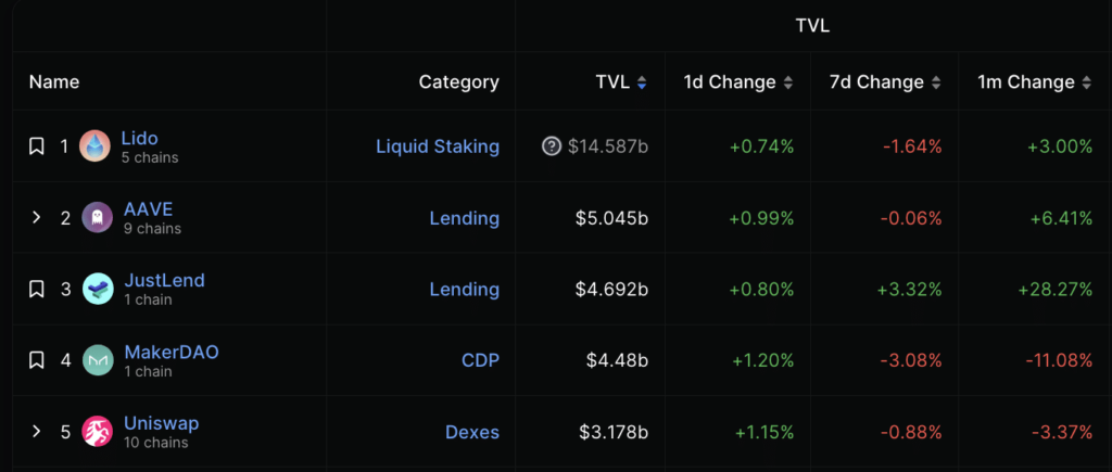 Based on information from DeFiLlama, MakerDAO’s TVL presently stands at $4.48 billion, placing it in fourth place behind Lido Finance [LDO], Aave [AAVE], and JustLend.