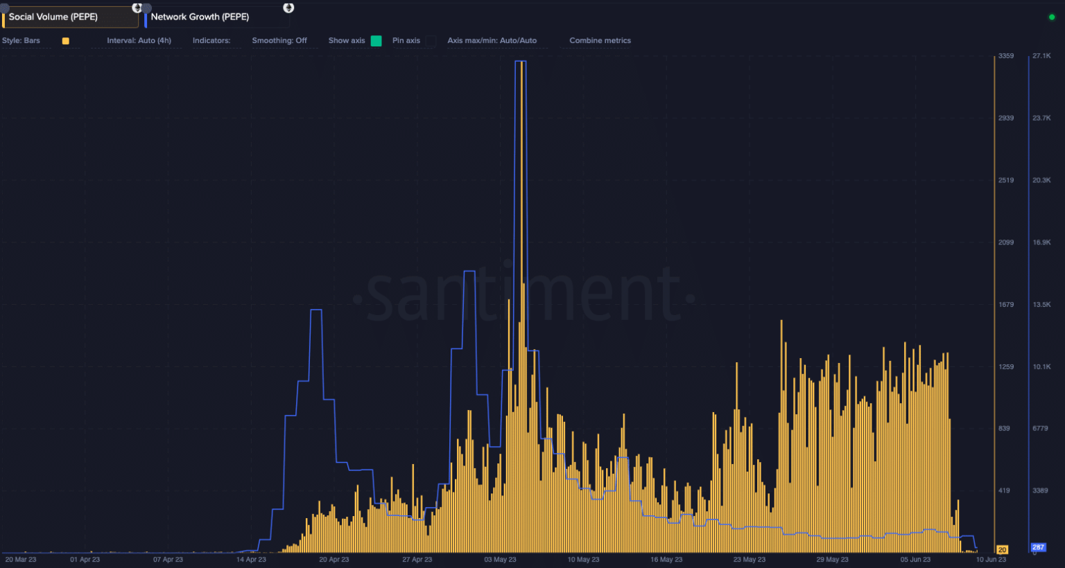 Regardless of the underwhelming state of its worth, PEPE’s social quantity remained significantly excessive during the last week. Nevertheless, the metric hit its lowest level at press time. This has been the case since 8 June.