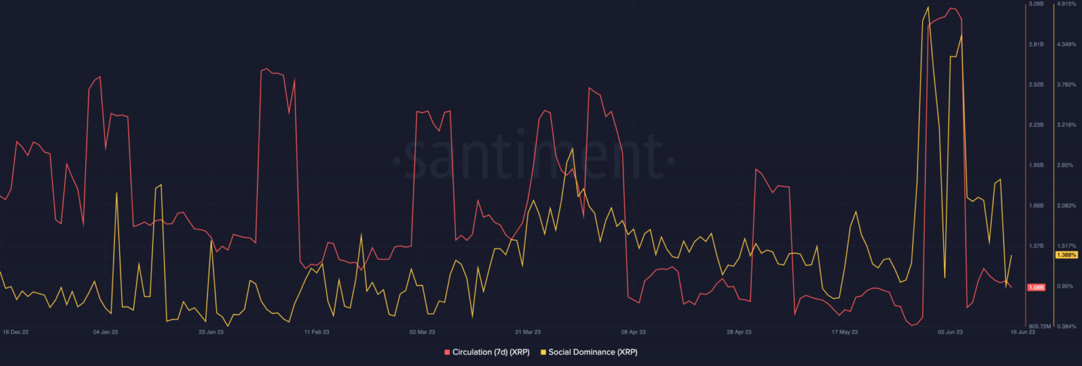 Moreover, XRP’s social dominance which went as excessive as 4.51% on 8 June, was right down to 1.388%. This indicated a decline within the XRP hype because the share of debate decreased.