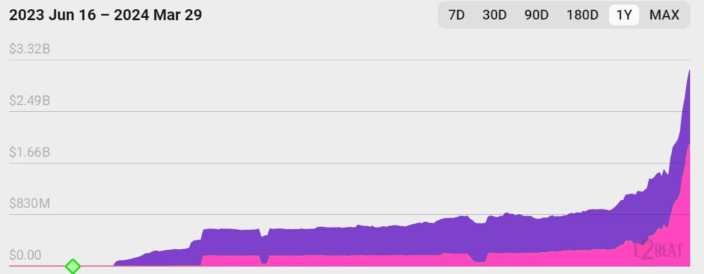 The Ethereum layer-2 community, Base, has witnessed a outstanding surge in belongings locked, hovering by roughly 200% over the past month to over $3 billion, in accordance with L2beat knowledge.
