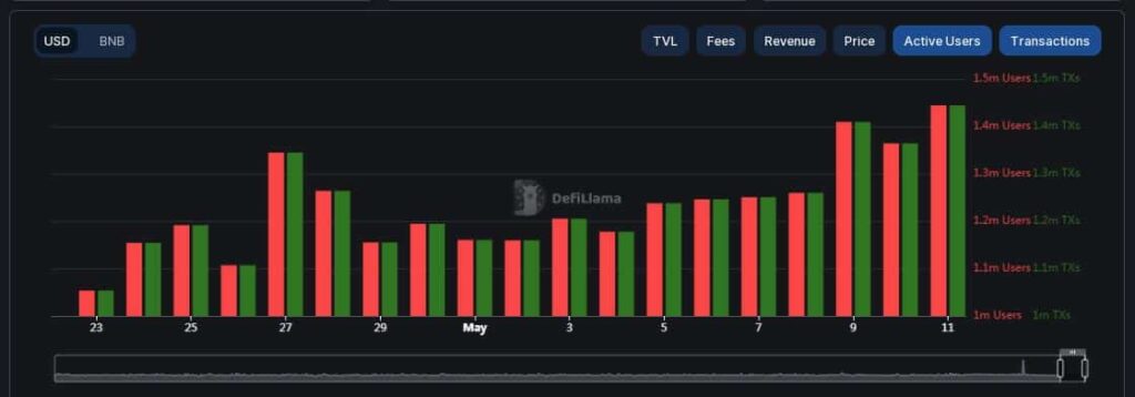 The announcement of the brand new buying and selling characteristic catalyzed buying and selling exercise on the BNB Chain. After the dip recorded on 10 Could, day by day energetic customers rebounded to a 5-week excessive within the final 24 hours.
