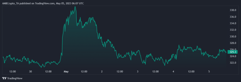 At press time, BNB was buying and selling at $325.3, down 0.36% in 24 hours. The altcoin’s market capitalization was as excessive as $50 billion, with its each day buying and selling quantity discovered to be $472M.