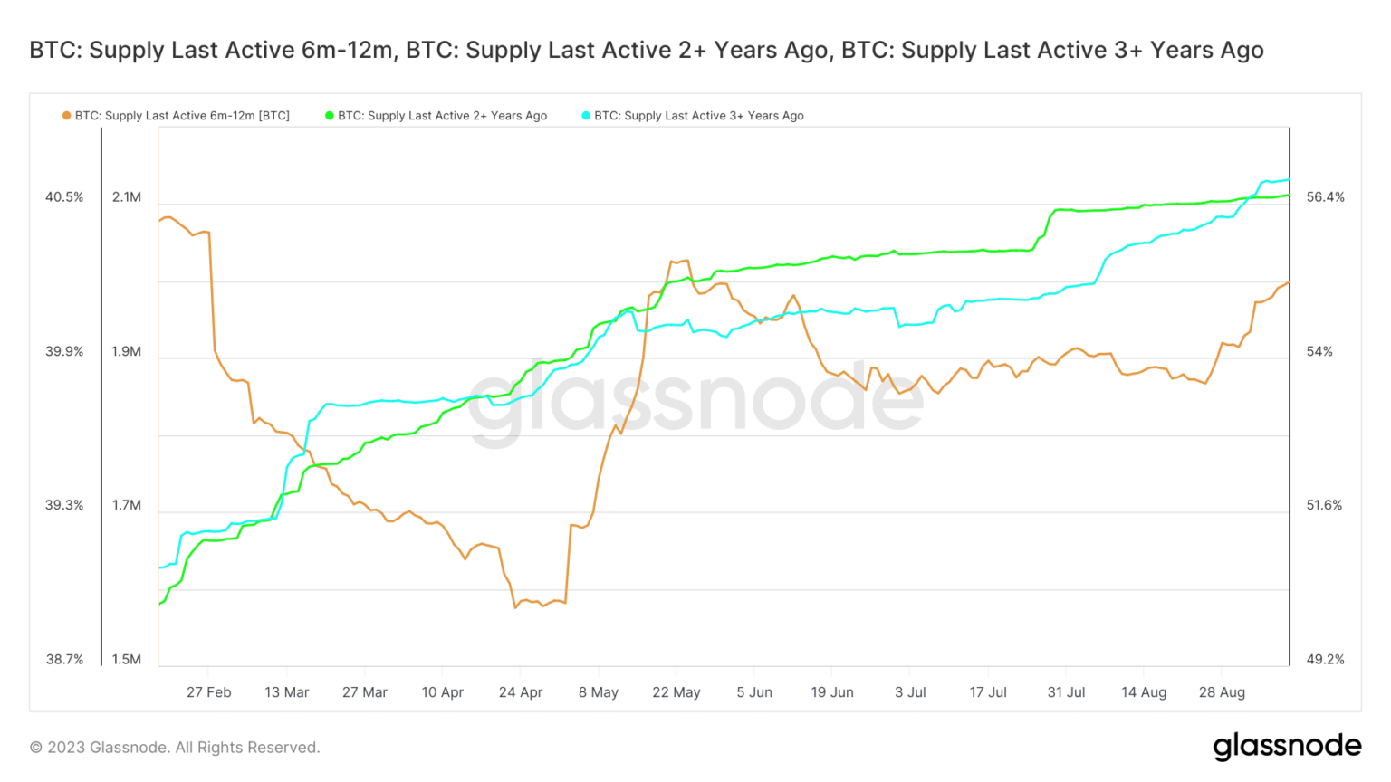Noticeably, the portion of Bitcoin’s provide held for no less than two years reached 56% whereas the stashes which haven’t been transacted on-chain for no less than three years hit 40%.