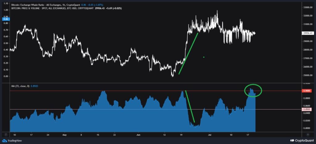 Change Whale Ratio is principally the relative dimension of the highest 10 influx transactions to complete inflows on an alternate. When whales start transferring cash in giant portions to exchanges, it introduces extra provide into the market and has usually been seen as a promote sign.
