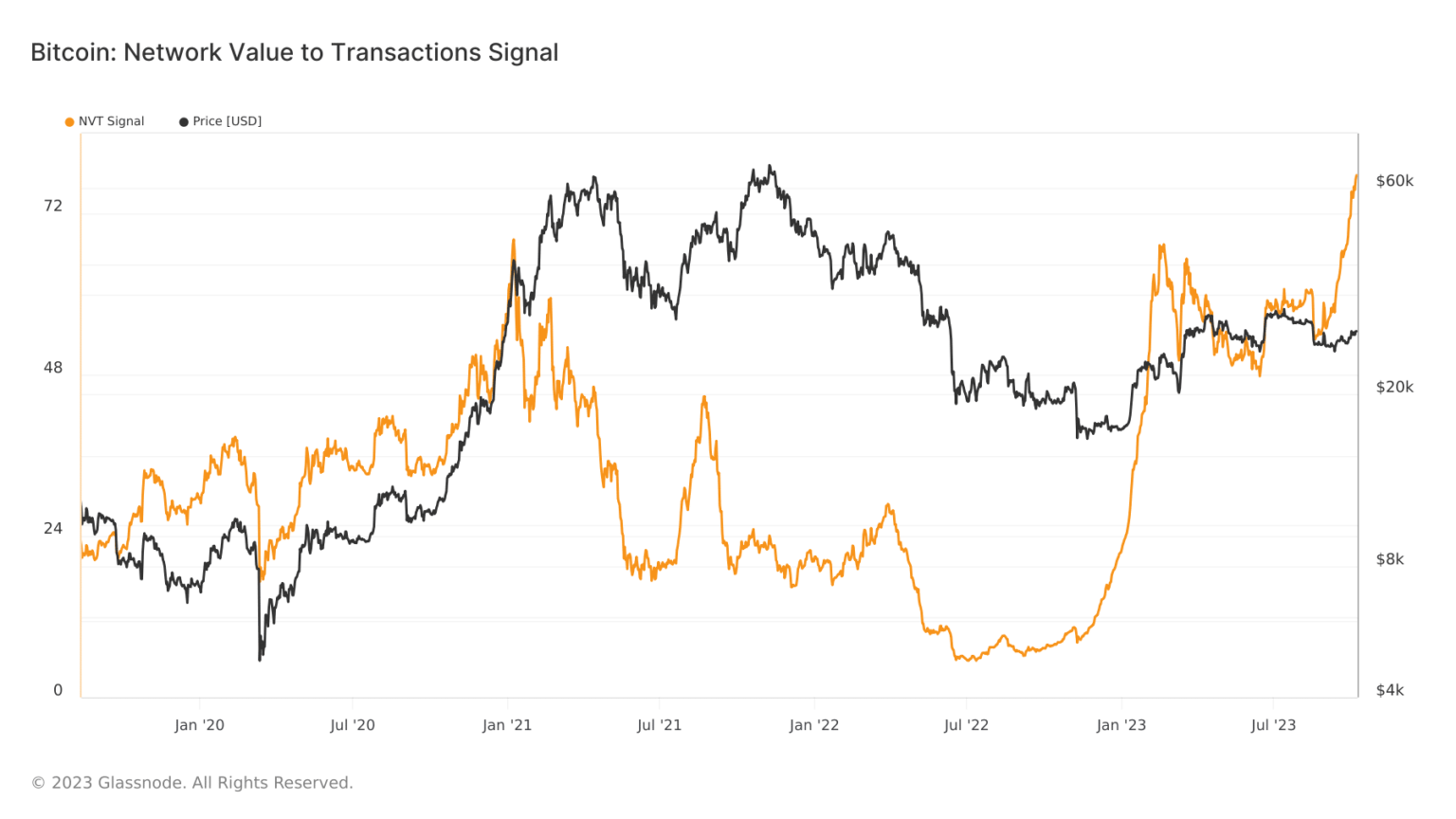 Nevertheless, latest spikes in NVT ratios trace that Bitcoin’s worth is now transferring independently of transactional utility, hinting at its rising function as a retailer of worth. Earlier, the NVT sign at all times spiked forward of a value uptick for BTC and fell forward of a value plummet.