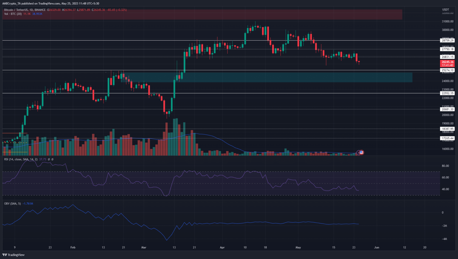 Over the previous two weeks, the bulls tried desperately to defend the $26.8k-$27k space however have been overcome on 24 Might. Traders in conventional markets appeared to be nervous in regards to the U.S. debt ceiling, which in flip negatively impacted the crypto markets.