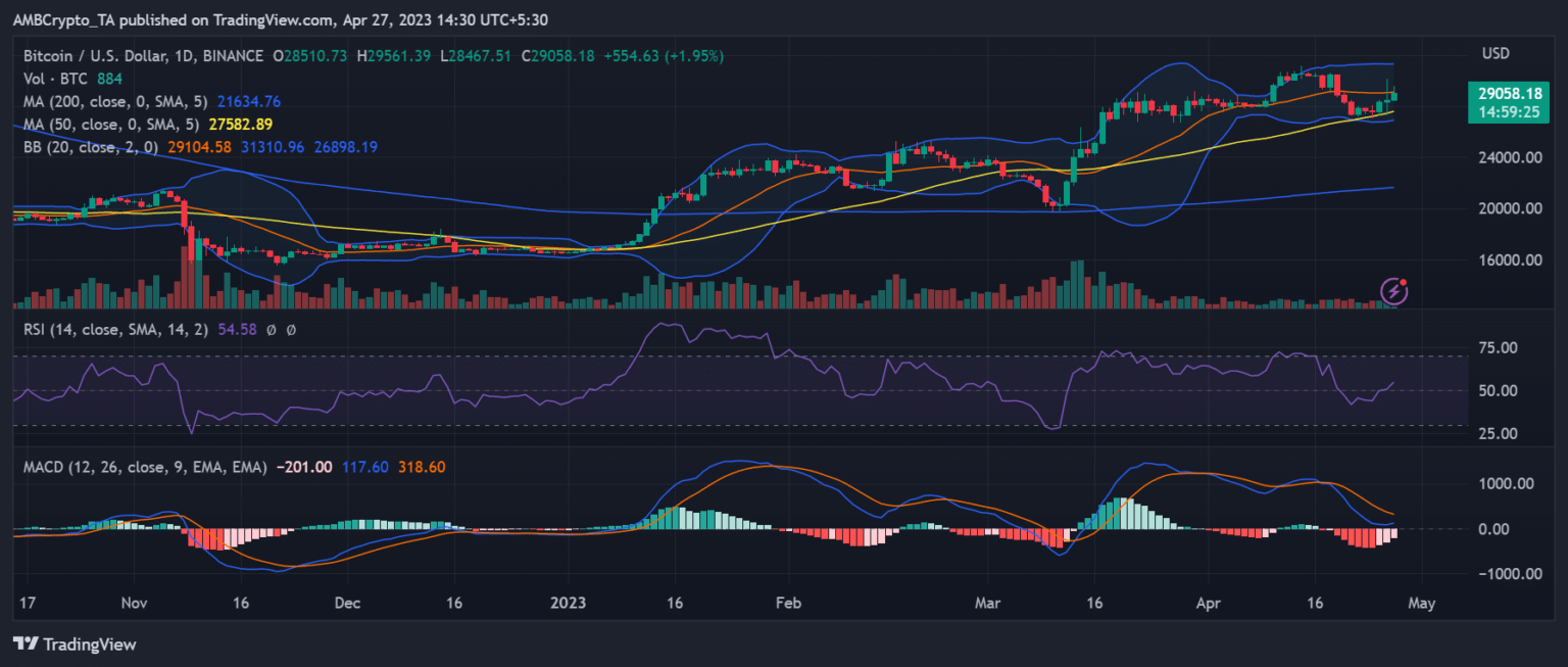 As of this writing, BTC was hovering round $29,000, displaying an almost 2% improve in worth. Whereas the Relative Energy Index (RSI) advised a barely bullish development, the Shifting Common Convergence Divergence (MACD) was under zero.