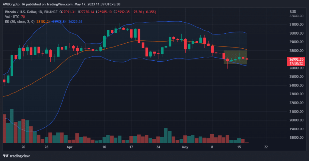 Bitcoin’s buying and selling ranges continued to slender, indicating the rising stage of market skepticism. Upon contemplating BTC’s worth chart on a each day time-frame, the king coin has oscillated inside a spread of $26,600-$27,400 during the last week.