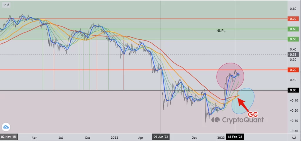 The overview performed by the analyst on BTC’s historic efficiency discovered {that a} golden cross, which usually happens between the 128 and 200-day transferring averages, indicators the tip of the buildup section when the NUPL metric reaches or surpasses 0.2. This signifies the graduation of a bull market.