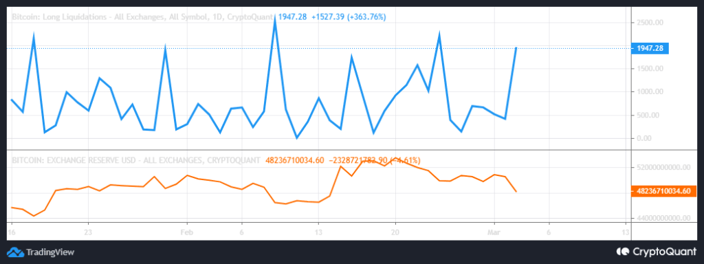 Bitcoin’s lengthy liquidations metric soared within the final 24 hours, proving that there have been a lot of leveraged positions. Liquidations surged by over 360% inside a matter of hours and this might need contributed to extra promote strain. Bitcoin change reserves drew down barely regardless of the worth drop and liquidations.
