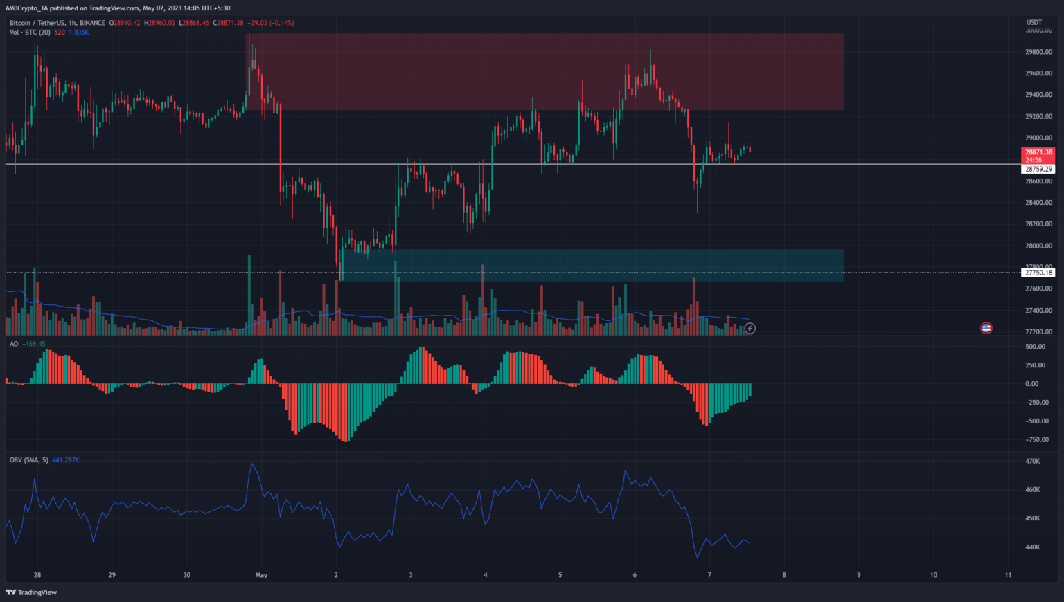 The Superior Oscillator fashioned inexperienced bars on its histogram over the previous 12 hours to point waning bearish momentum. This corresponded to BTC’s bounce from $28.6k throughout this time. On the time of writing, Bitcoin was altering arms at $28,871, measuring a close to 2% bounce from the $28.3k native lows.