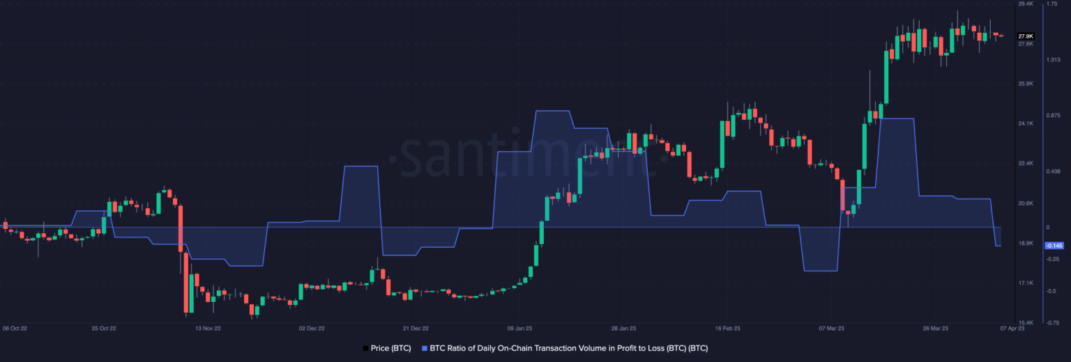 In response to Santiment, the coin’s day by day on-chain transaction quantity in profit-to-loss ratio fell into the unfavourable area for the primary time in 5 weeks. This metric reveals if transactions in revenue are outpacing these in losses or in any other case. At press time, the worth was -0.145.