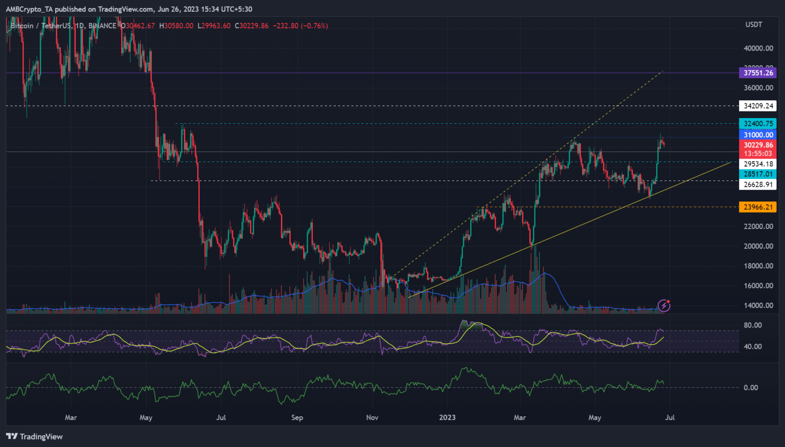Bitcoin’s [BTC] worth motion has stayed above $30k since 21 June. It graced a brand new excessive in 2023 of 31.4k on 23 June however retraced to the $30k zone, buying and selling at $30.2k on the time of writing.