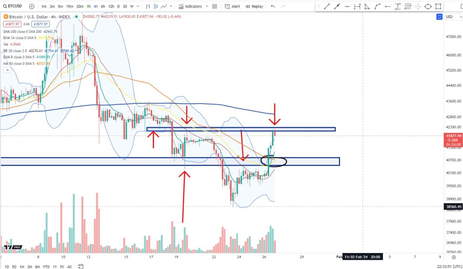 At time of writing, BTC is buying and selling at $42,278.