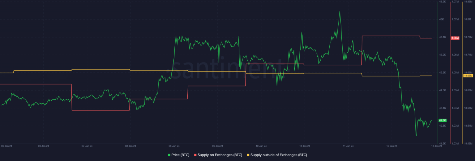 Our evaluation revealed that BTC’s provide on exchanges went above its provide exterior of exchanges, clearly indicating that buyers had been dumping BTC. These main sell-offs additionally might need performed a significant function in BTC’s newest value correction.