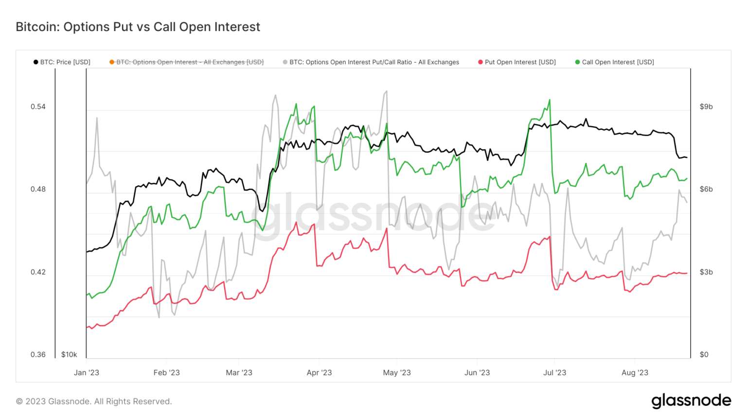 However, the choices market remained remarkably resilient throughout Bitcoin’s worth decline. Glassnode information confirmed a constant open curiosity for each name and put choices, indicating that these devices had been largely unaffected by the market volatility.