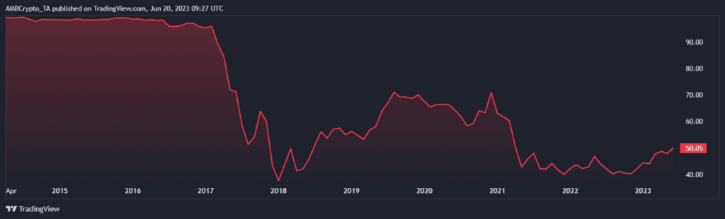 Bitcoin’s [BTC] dominance has been on the rise for the previous couple of days. That is the primary time that it has reclaimed the necessary 50% dominance degree since April 2021, and it is a vital remark for a number of causes.