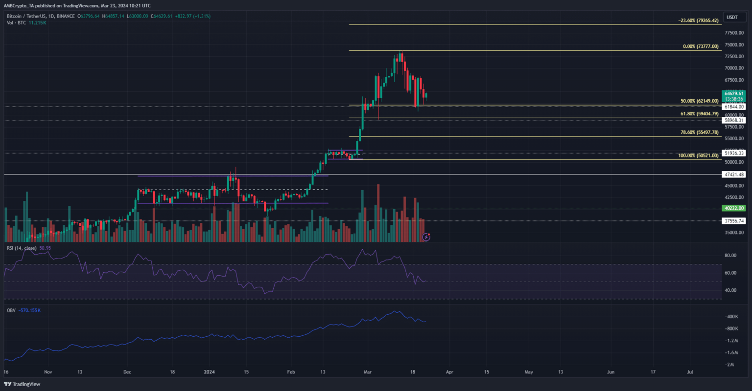 Nearer to present market costs, the $60.8k, $57.2k, and $55k ranges had been extra attainable targets for the bears. A sweep of those liquidity pockets might pave the best way for Bitcoin to renew its uptrend in earnest.