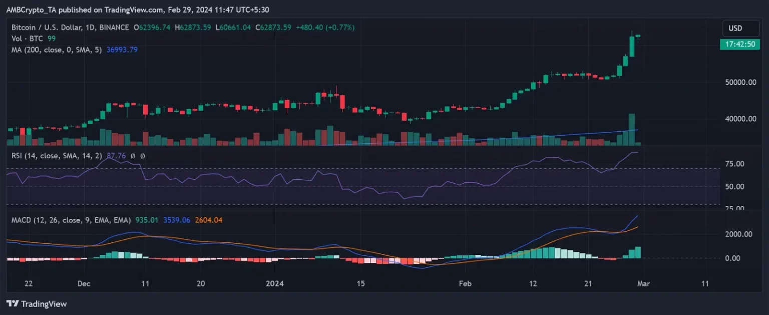 On the time of this writing, Bitcoin was buying and selling near $63,000, with an virtually 1% enhance noticed. Moreover, the current upswing has propelled Bitcoin into the oversold zone, as indicated by the Relative Power Index, which was at over 85 on the time of this writing.