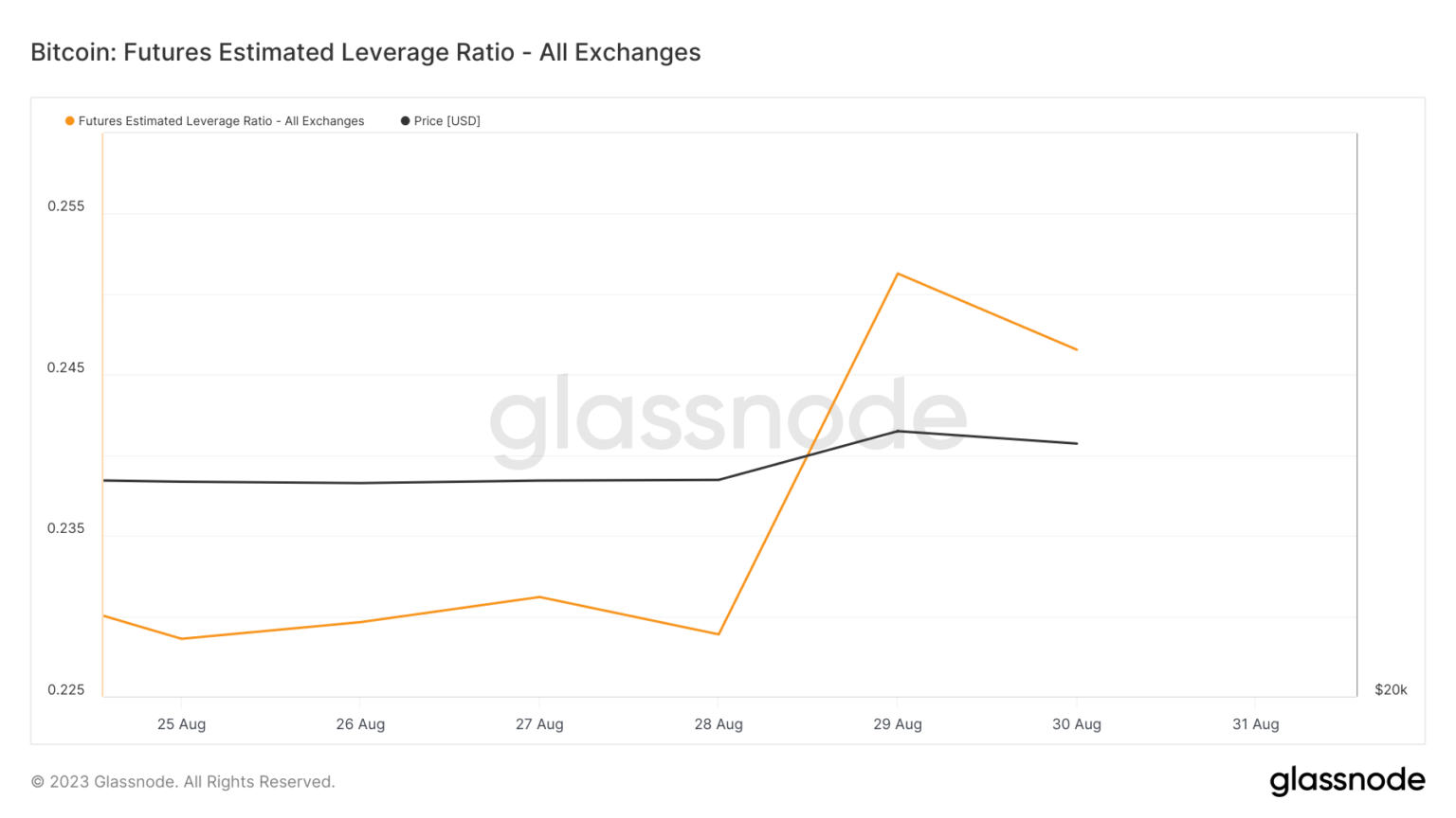 The Estimated Leverage Ratio (ELR) skilled a leap from 0.22 to 0.25 on Aug. 30, following Bitcoin’s leap from $26,100 to $27,700.