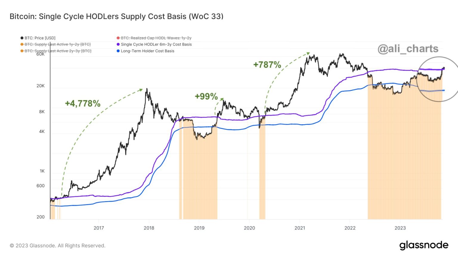 Now, here’s a chart that reveals the pattern in the price foundation of the single-cycle LTHs over the previous few years: