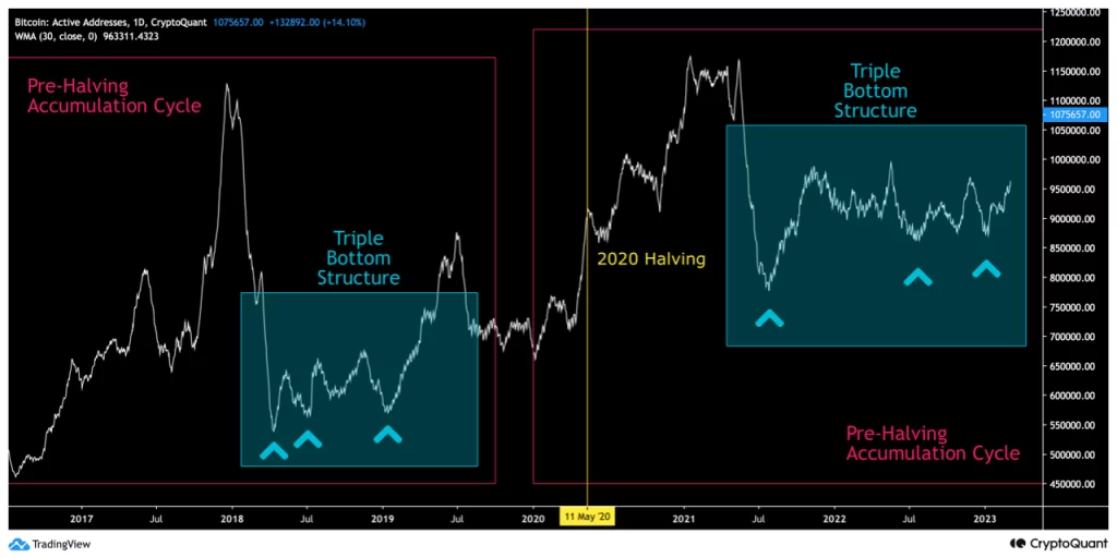 In accordance with the analyst, the 2021-2023 cycle has additionally proven the same construction as lively addresses reached three particular person lows.