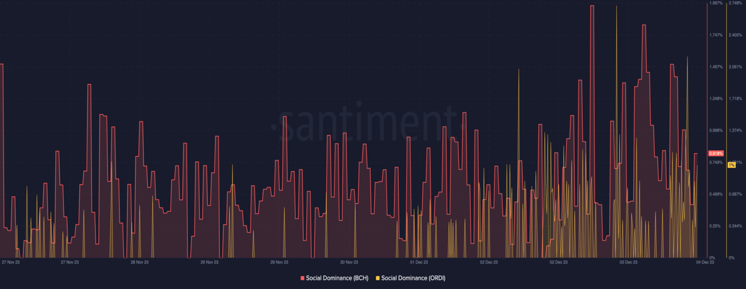 It’s also vital to say that ORDI’s rise to $42.25 means it had reached a brand new All-Time Excessive (ATH). When it comes to social dominance, Santiment knowledge analyzed by AMBCrypto confirmed that ORDI and BCH have been rising.