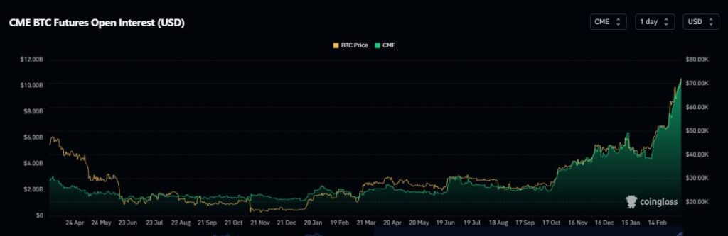 Based on AMBCrypto’s examination of Coinglass’ information, the Open Curiosity (OI) on the world’s largest Bitcoin futures change, CME, rose 3.89% within the final 24 hours to high $10 billion for the very first time.