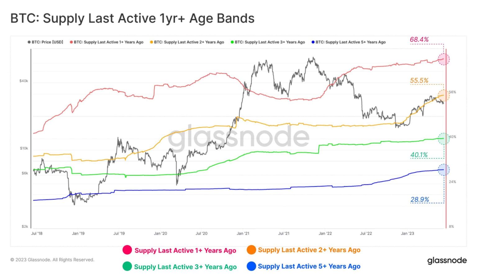 As indicated within the above graph, BTC’s dormant provide throughout most age bands has elevated considerably for the reason that begin of 2023. Nonetheless, probably the most putting development was the rising provide within the 2+ years band.