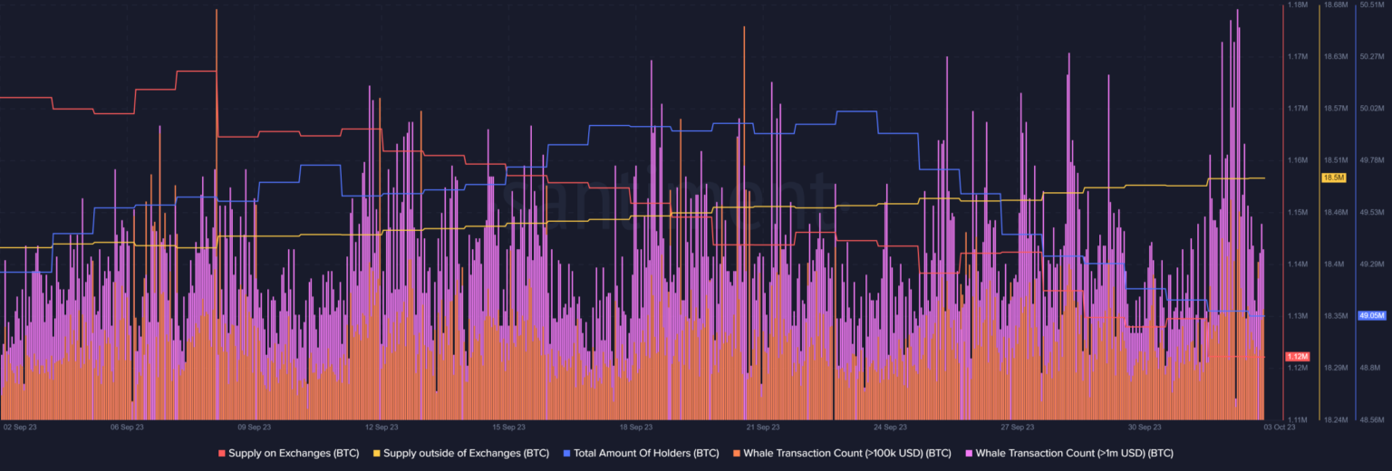 As per the chart, BTC’s provide on exchanges dropped sharply whereas its provide outdoors of exchanges went up. Whale exercise across the coin was additionally excessive, which means that the large gamers have been actively buying and selling the coin. Nevertheless, it was stunning to see that, regardless of a hike in shopping for stress, Bitcoin’s whole quantity of holders dropped in the previous couple of weeks.