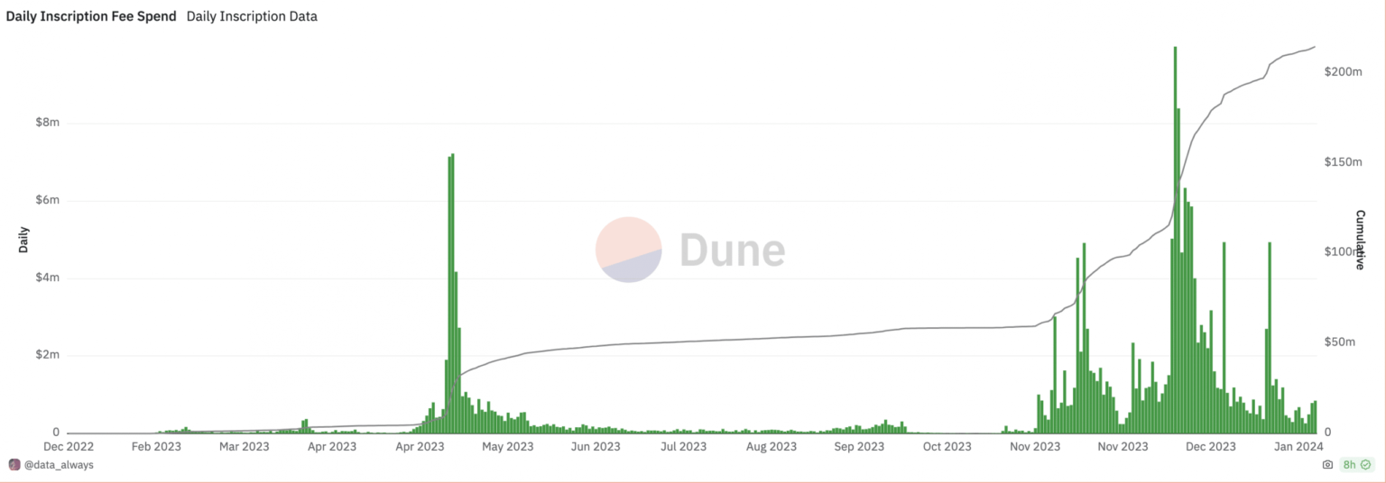 As of the twenty eighth of January, inscription minting charges totaled $848,000.