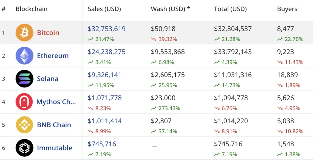 - Bitcoin NFTs surged, outselling Ethereum with an 80% weekly enhance.