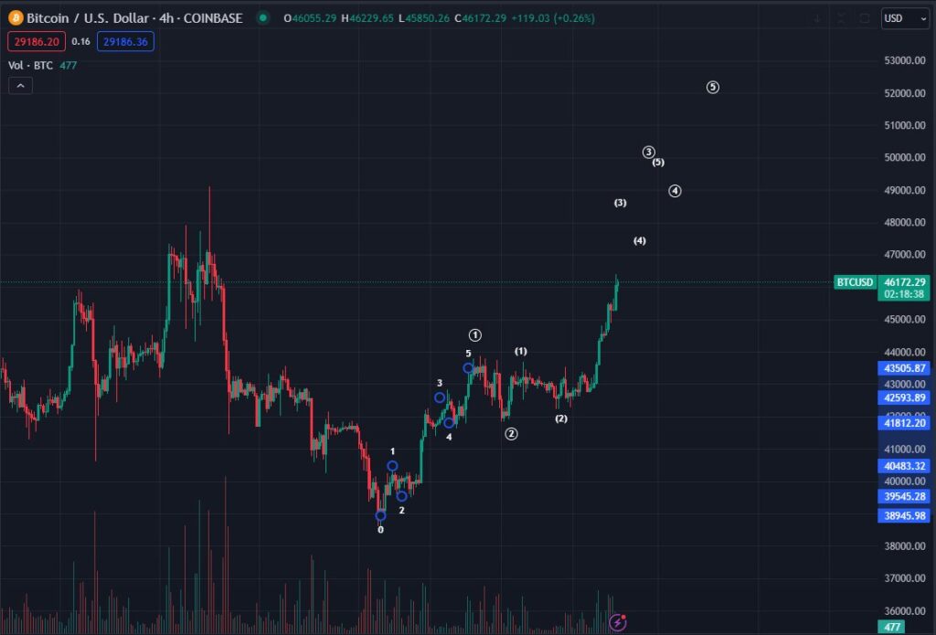Bluntz shares a chart suggesting that BTC might finish its main third wave as soon as it hits $50,000 earlier than correcting and rallying to $52,000.